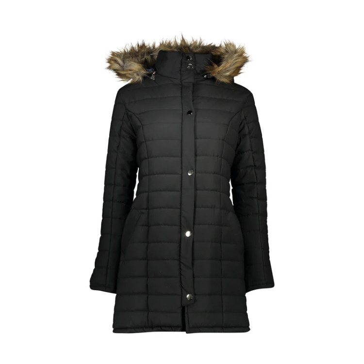 رنگ مشکی، برش فیت و یقه ایستده، یعنی اقتدار و زیبایی توامان. این کاپشن به آسانی میتواند تکمیل کننده یک استایل «اسمارت کژوال» (Smart Casual) باشد. قد کاپشن بلند و تا روی زانو است که حال و هوای بسیار کلاسیک و متفاوتی به آن داده است. نحوه بسته شدن این پالتو به وسیله دکمه تا زیر یقه است. وجود دو جیب در طرفین یعنی فضای مناسب برای قرار دادن انواع وسایل شخصی با امنیت کامل و بدون به هم ریختن فرم و استایل کاپشن. دوخت و برش این کاپشن زنانه بسیار دقیق و تمیز انجام شده و فرم و فیت مناسبی روی بدن خواهد داشت. ضمن این که وجود یک یک کلاه با لبه خزدار، ظاهری متفاوت به آن داده است. این کاپشن به همراه انواع شلوار جین و پارچهای ظاهر زیبایی خلق خواهد کرد. رنگ جهانی و کامل مشکی انتخاب هر رنگ و طرحی را برای همراهی با این لباس آسان کرده است. جنس رویه بیرونی کاپشن پلی استر است، بنابراین برای حفظ الیاف پارچه آن، از شستشوی آن با دست و ماشین لباسشویی خودداری کنید و فقط خشکشویی را برای شستشوی آن انتخاب کنید.